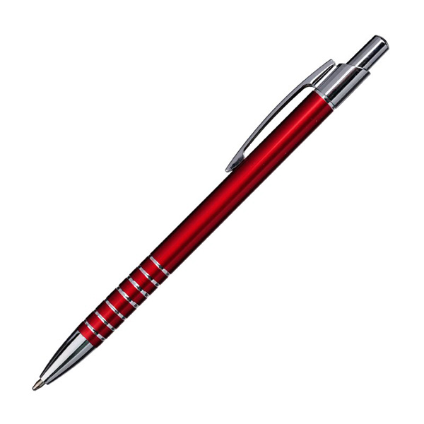 Aluminiowy długopis z metalową skuwką. Wyposażony w niebieski wkład.