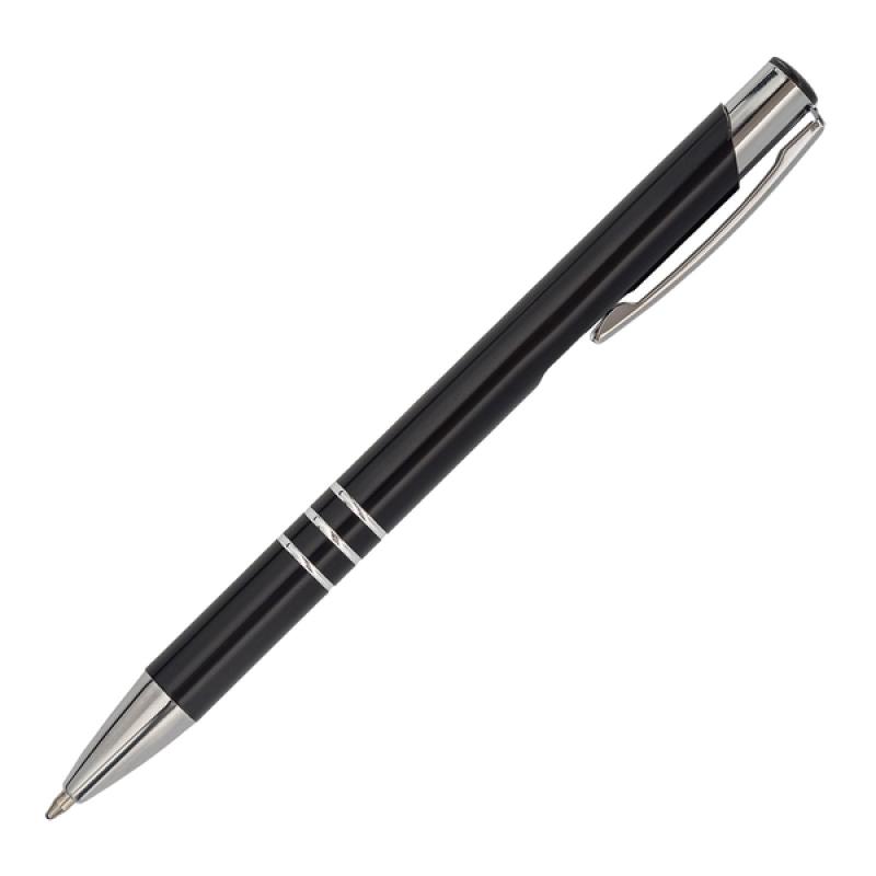 Długopis aluminiowy. Wyposażony w niebieski wkład.