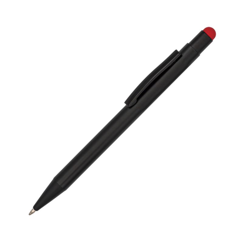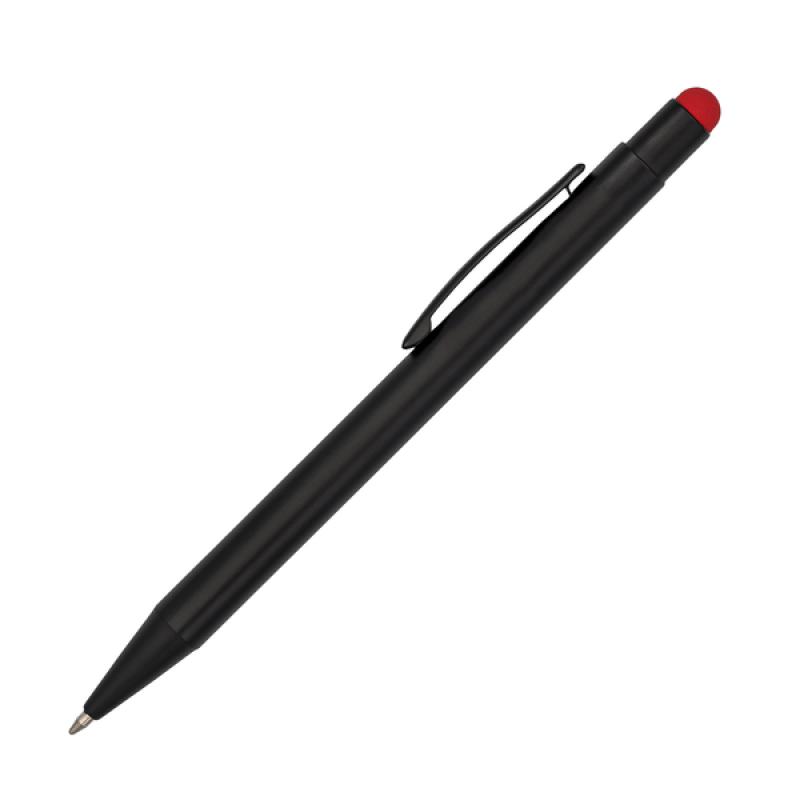 Długopis z czarnym korpusem i kolorową końcówką do ekranów dotykowych. Możliwość wykonana błyszczącego logo w kolorze nawiązującym do koloru końcówki. Niebieski wkład.