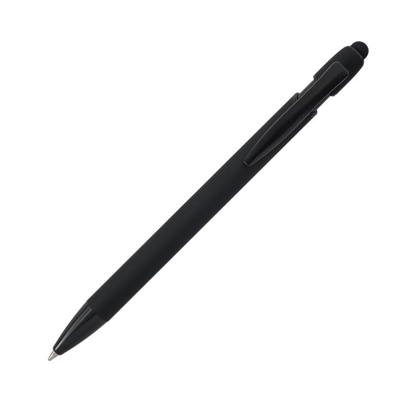 Aluminiowy długopis o przyjemnym w dotyku, satynowym wykończeniu z czarnymi elementami. Wyposażony w końcówkę do ekranów dotykowych. Niebieski wkład.