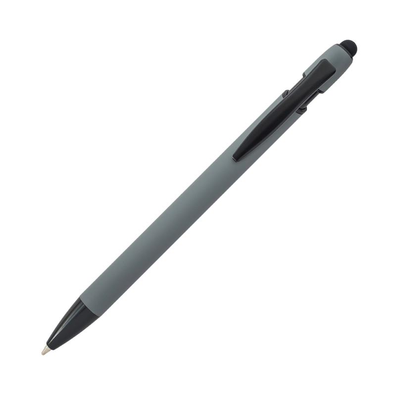 Aluminiowy długopis o przyjemnym w dotyku, satynowym wykończeniu z czarnymi elementami. Wyposażony w końcówkę do ekranów dotykowych. Niebieski wkład.