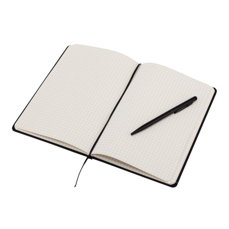 Zestaw składający się z notesu i długopisu. Notatnik A5 w twardej oprawie pokrytej tkaniną i ekoskórą z tasiemką do zaznaczania strony oraz elastyczną gumką chroniącą wnętrze. 80 kartek w kratkę, gramatura papieru 70 g/m2. Długopis aluminiowy z rysikiem do obsługi ekranów dotykowych, wyposażony w niebieski wkład. Zestaw pakowany w czarne upominkowe pudełko.