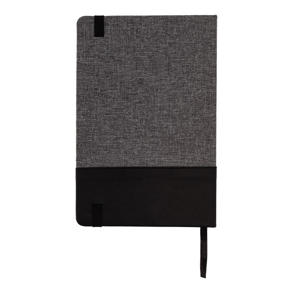 Notatnik A5 w twardej oprawie pokrytej tkaniną i ekoskórą, z tasiemką do zaznaczania strony oraz elastyczną gumką chroniącą wnętrze. 80 kartek w linie, gramatura papieru 70 g/m2.