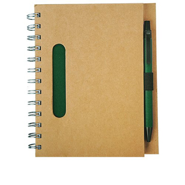 Notatnik 70 kartek formatu B6 w linie z papieru z surowców wtórnych z długopisem o wymiarach 137x10x10 mm części plastikowe są biodegradowalne.