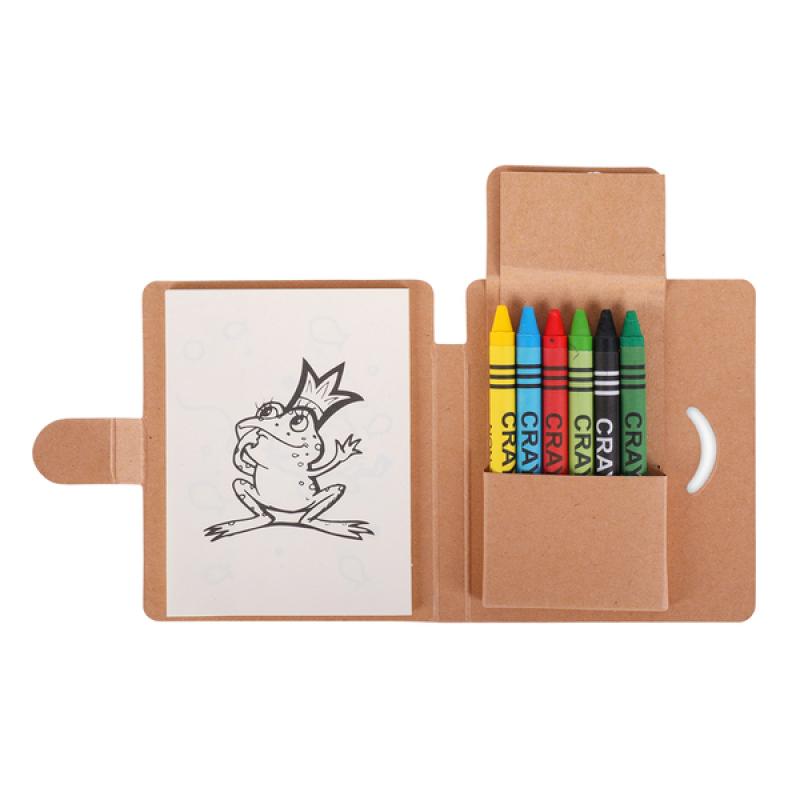 Zestaw do kolorowania składający się z 8 zajmujących kolorowanek, 6 kredek świecowych oraz 25 - kartkowego notesu (gramatura 70g/m2).