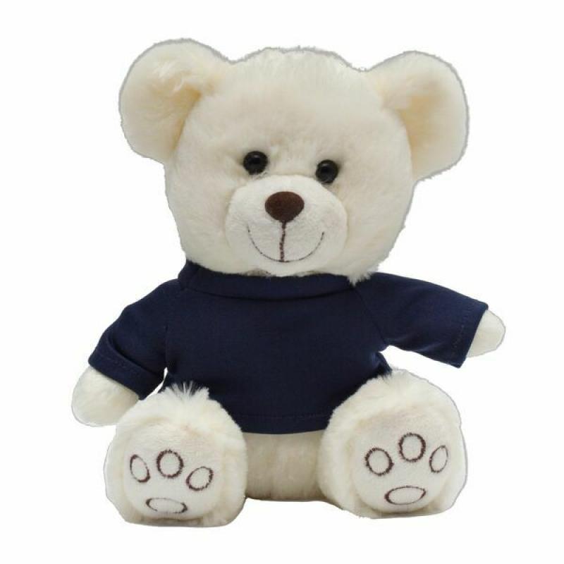 Maskotka przytulanka dla dzieci w granatowej koszulce, na której można wykonać znakowanie.