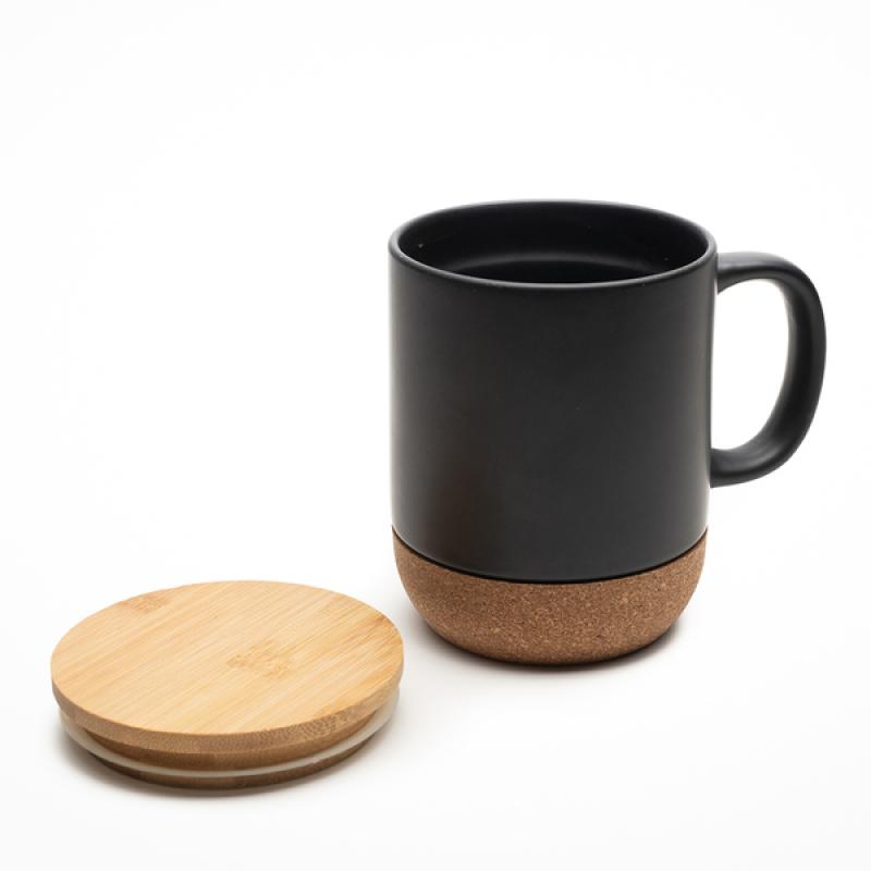 Kubek ceramiczny o pojemności 400 ml o matowej powierzchni. Bambusowa przykrywka i podstawa wykonana z naturalnego korka.