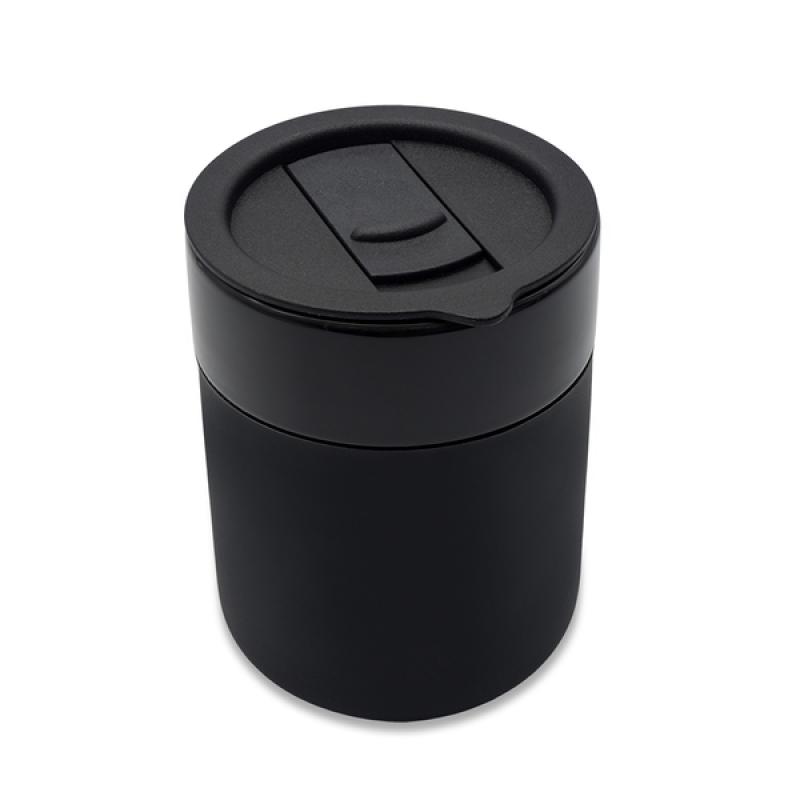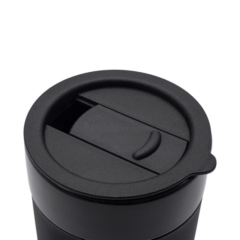 Ceramiczny kubek o pojemności 370 ml. Posiada silikonowe gładkie etui oraz pokrywkę. Minimalistyczny i funkcjonalny design.