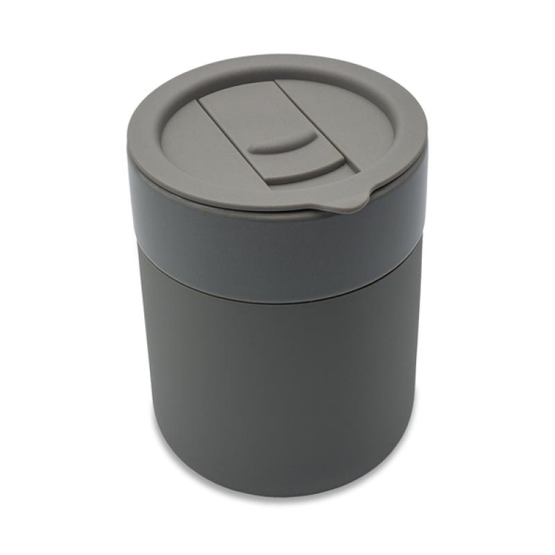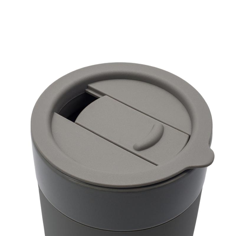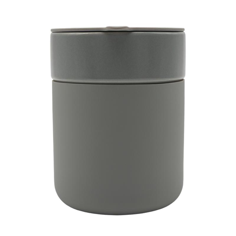 Ceramiczny kubek o pojemności 370 ml. Posiada silikonowe gładkie etui oraz pokrywkę. Minimalistyczny i funkcjonalny design.
