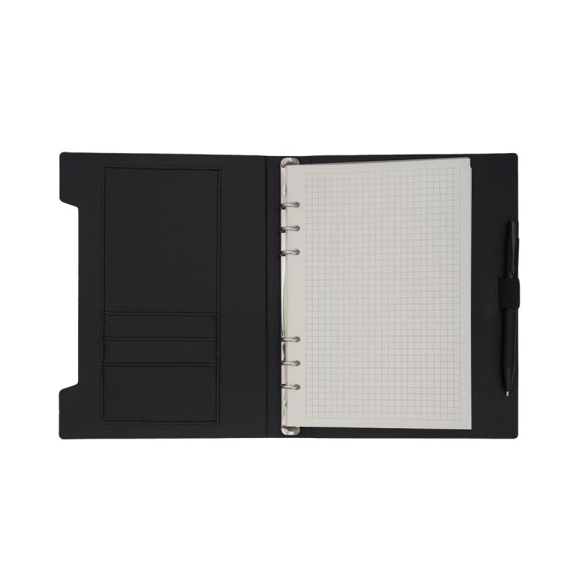 Organizer w twardej oprawie z wymiennym notesem A5 (120 kartek w kratkę, 70g/m2). Zawiera 1 dużą kieszeń, 3 mniejsze kieszonki oraz uchwyt na długopis.