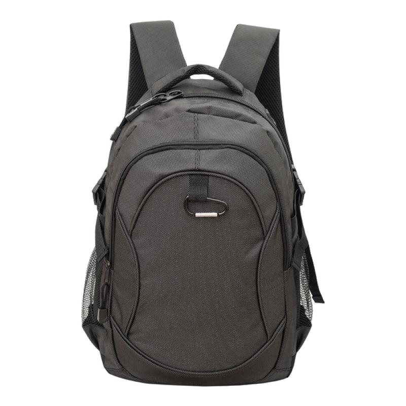 Praktyczny i solidny plecak posiada komorę główną zamykaną na gruby zamek oraz kieszeń wewnętrzną także zapinaną na zamek. Duża przednia kieszeń. 2 boczne kieszenie z siatki. 2 paski boczne z klamrami. Otwór na słuchawki. Podszewka z poliestru 210 T. Miękkie plecy i szelki. Pojemność 16 L.
