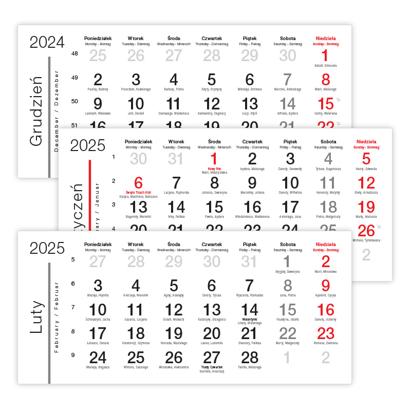 Kalendarium Polsko-angielsko-niemieckie, imieniny, numeracja tygodni