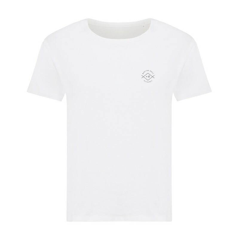 Koszulka damska, regularny krój, okrągły dekolt, krótkie rękawy, wykonana w 30% z bawełny z recyklingu i w 70% z bawełny organicznej o gramaturze 160 g/m2, posiada wbudowany znacznik AWARE™, który potwierdza wykorzystanie materiałów z recyklingu, posiada kod QR na metce, który prowadzi do cyfrowego paszportu produktu, 2% wpływów z każdego sprzedanego produktu z kolekcji Impact jest przekazywane na rzecz Water.org, ślad węglowy produktu: 2,92 kg CO2