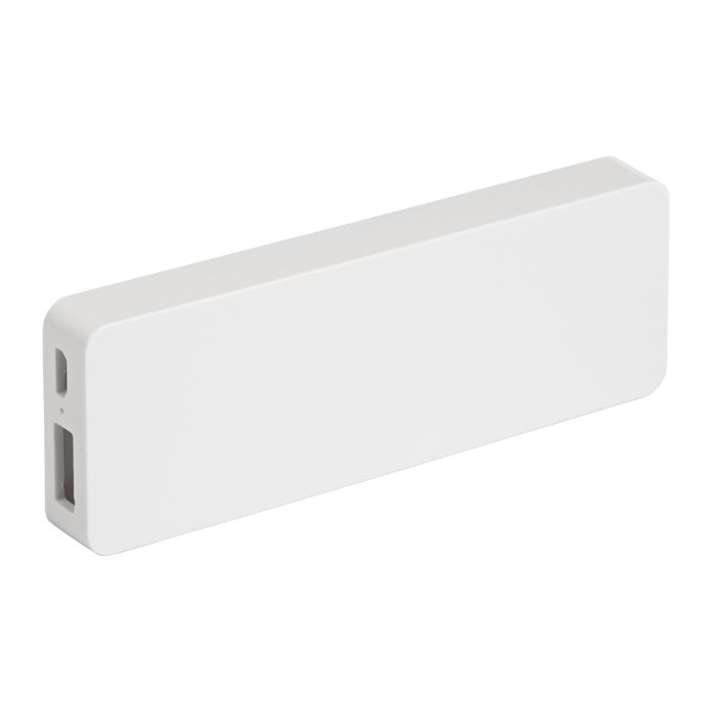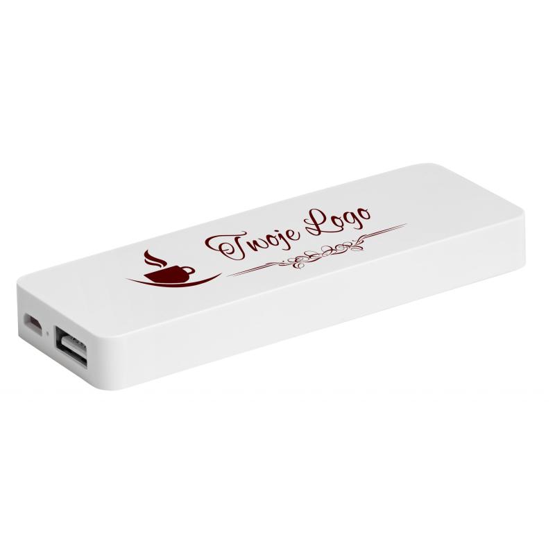 POWER BANK (zasilacz awaryjny do urządzeń mobilnych). Posiada sygnalizację LED zasilania i ładowania. Obudowa wykonana jest z białego plastiku.
