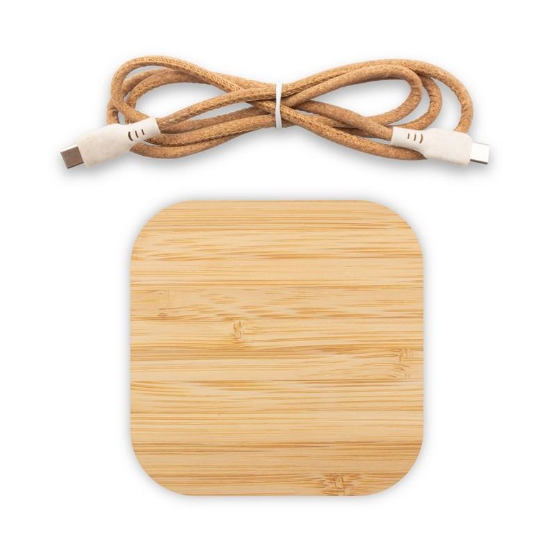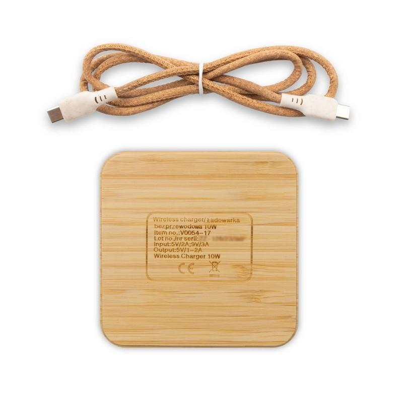 Bambusowa ładowarka bezprzewodowa 10W B`RIGHT, działa z telefonami posiadającymi możliwość ładowania indukcyjnego, 2 wyjścia USB 5V/1-2A, wejście USB typu C, w komplecie korkowy kabel z 2 końcówkami USB typu C wykonanymi z włókien słomy pszenicznej