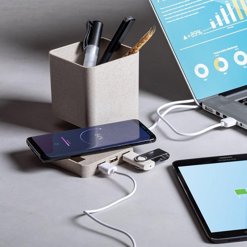 Ładowarka bezprzewodowa 5W z włókien słomy pszenicznej, działa z telefonami posiadającymi możliwość ładowania indukcyjnego, wyjście bezprzewodowe 5V DC 1A, hub USB 2.0 z 3 portami, pojemnik na przybory do pisania, kabel micro USB w komplecie