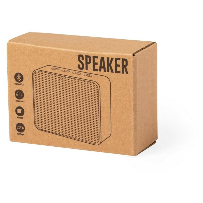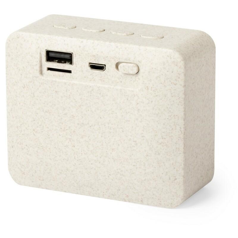 Głośnik bezprzewodowy BT 5.0 3W z włókien słomy pszenicznej, posiada funkcję odbierania połączeń oraz czytnik kart micro SD (nie dołączona), wbudowany mikrofon, gniazdo USB, bateria 300 mAh, zasięg do 10 m, ładowany przez USB, kabel micro USB w komplecie