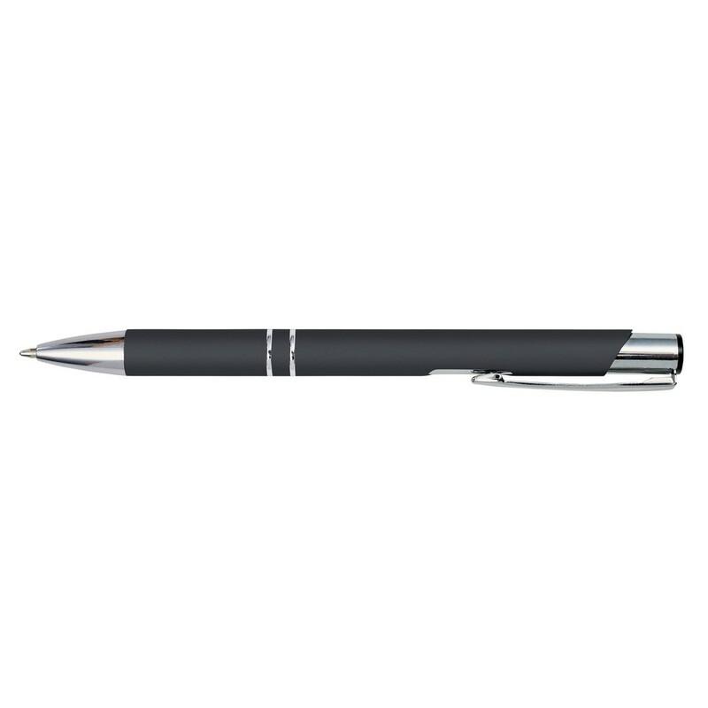 Długopis z gumowanym wykończeniem i srebrnymi elementami, grawer ukazuje lustrzaną powierzchnię