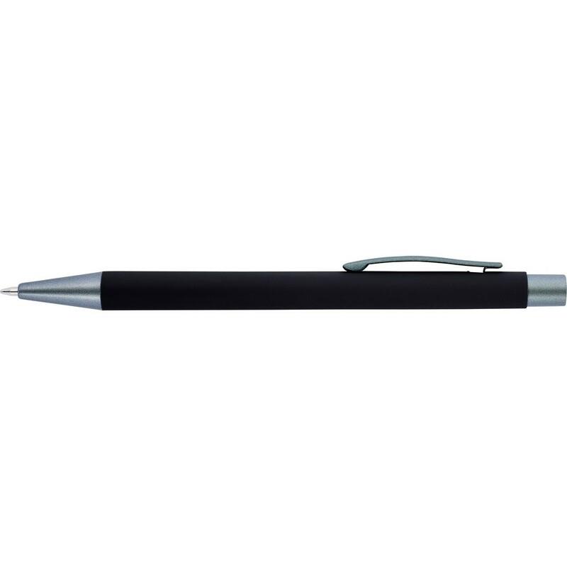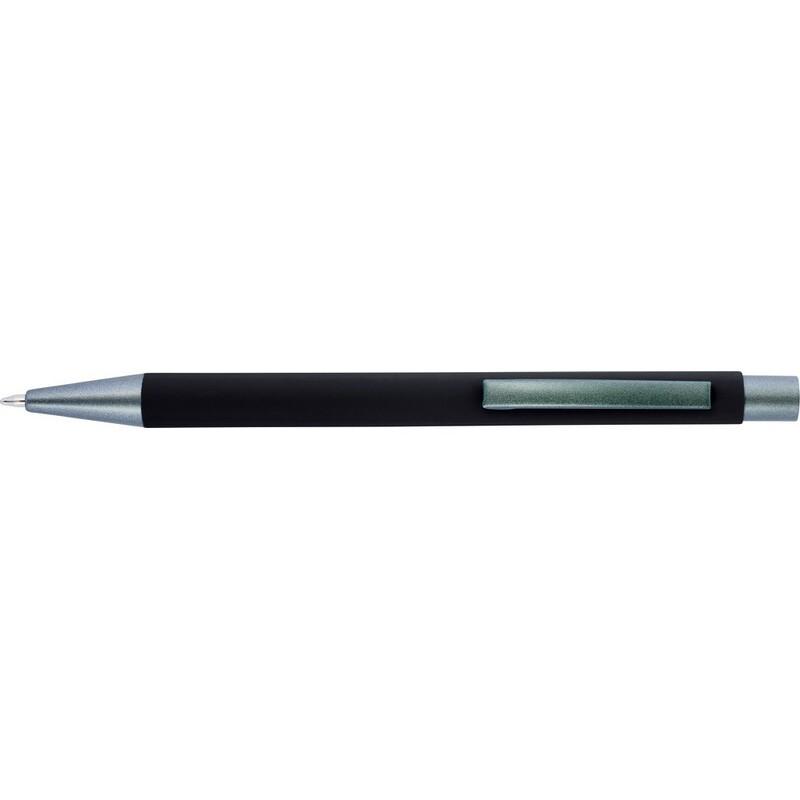 Długopis z kolorowym, gumowanym trzonem i szarymi elementami, grawer ukazuje lustrzaną powierzchnię