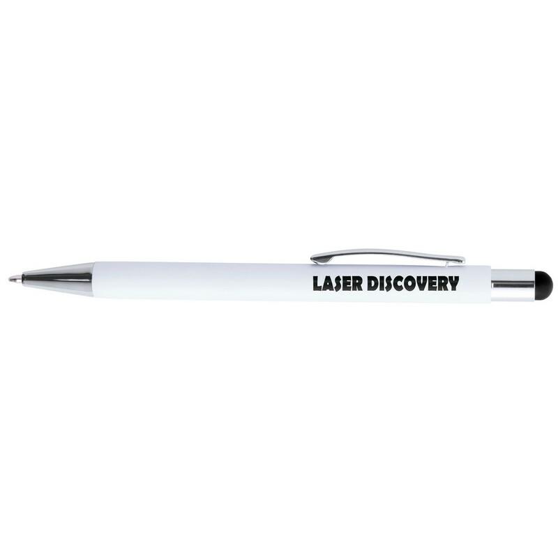 Długopis, touch pen, biały trzon, grawer ukazuje lustrzaną powierzchnię w kolorze gumowej końcówki