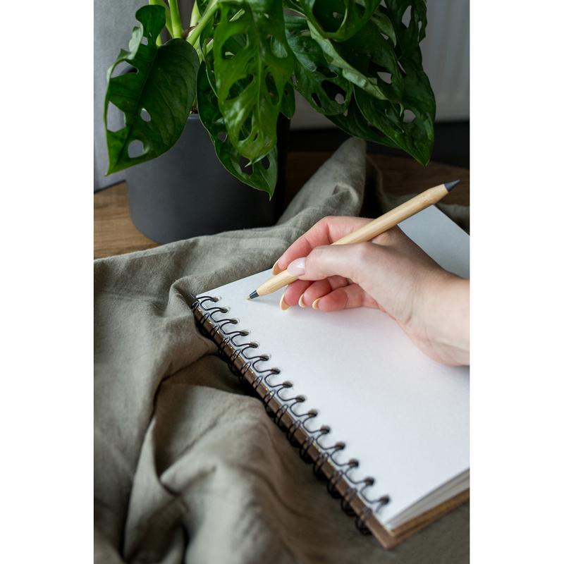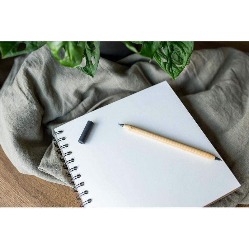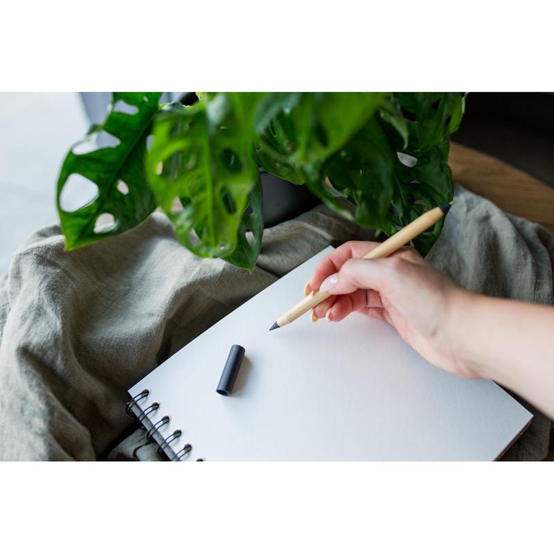 Długopis 2 w 1, "wieczny" ołówek, dzięki wykorzystaniu specjalnej wolnościerającej się końcówki długość pisania ołówka to około 1500 metrów, naostrzony, bambusowy trzon, dwie kolorowe zatyczki wykonane z papieru