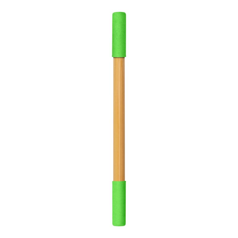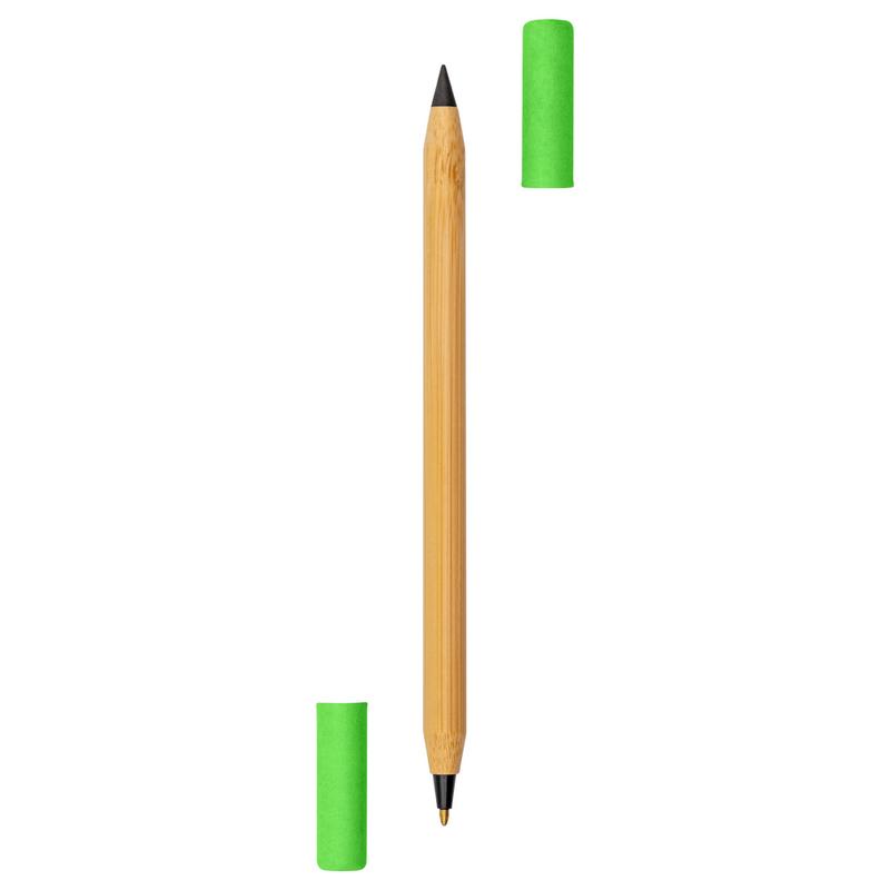 Długopis 2 w 1, "wieczny" ołówek, dzięki wykorzystaniu specjalnej wolnościerającej się końcówki długość pisania ołówka to około 1500 metrów, naostrzony, bambusowy trzon, dwie kolorowe zatyczki wykonane z papieru