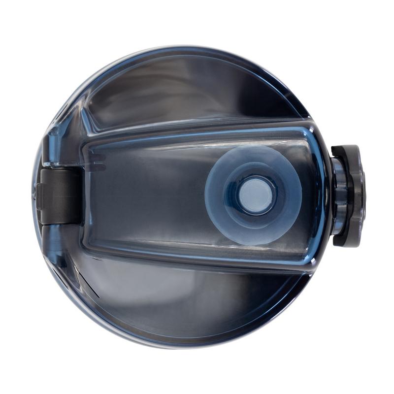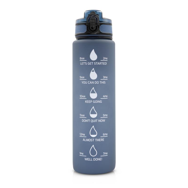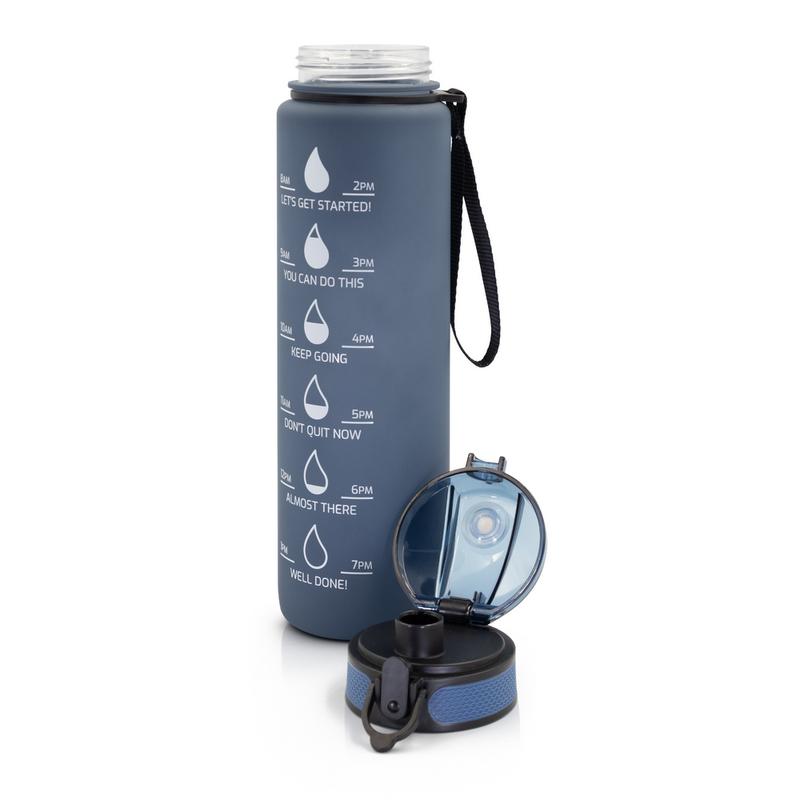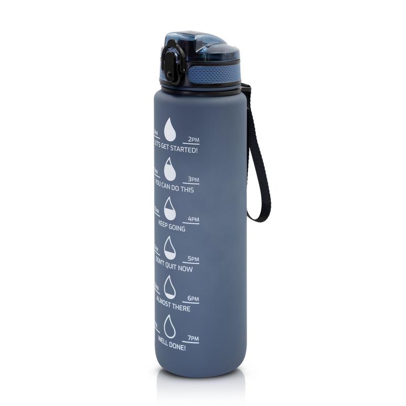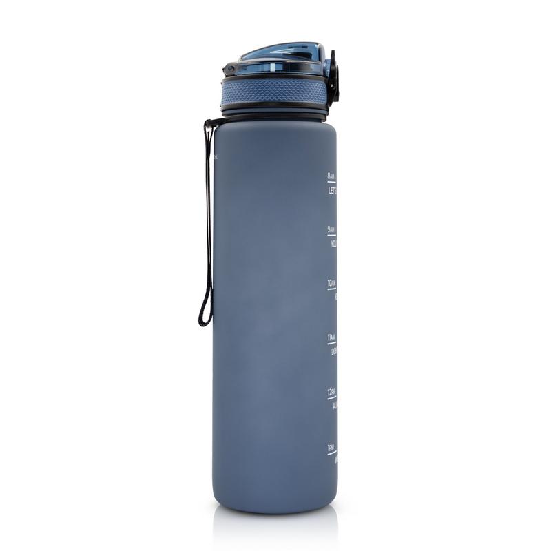 Butelka sportowa 1000 ml, skala ml z jednej strony i miarka motywacyjna z drugiej strony, zamknięcie z blokadą, pasek na rękę (pakowany oddzielnie), gumowane wykończenie, przeznaczona wyłącznie do zimnych i niegazowanych napojów