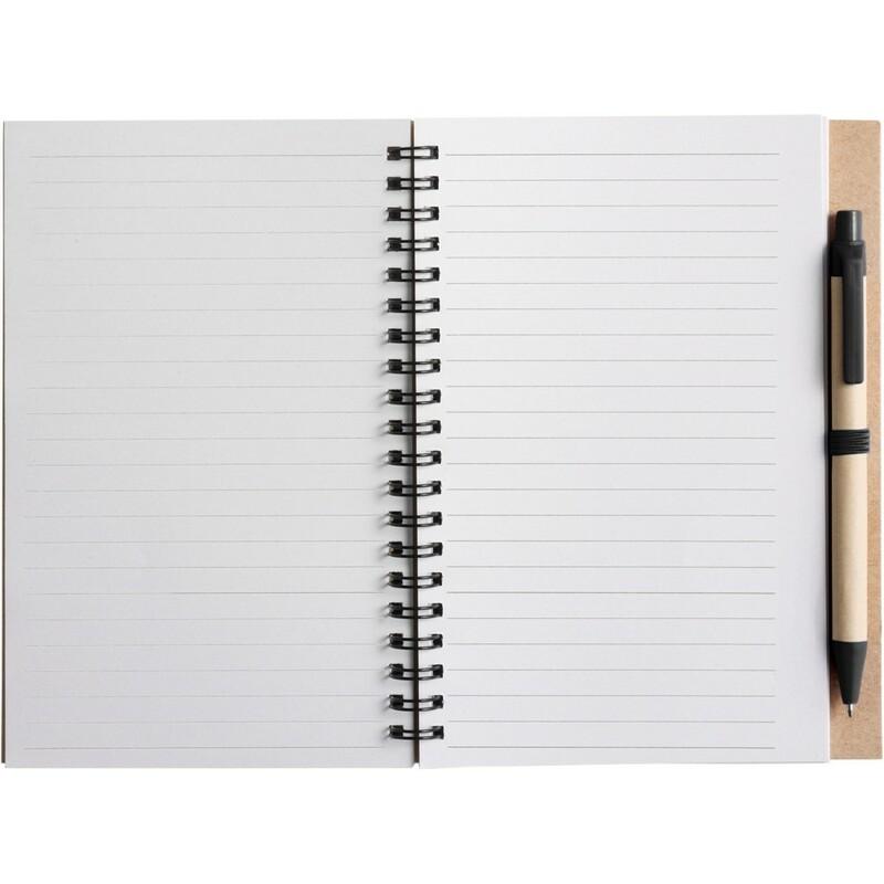 Ekologiczny notatnik (ok. A5, ok. 60 kartek w linie), dołączony biodegradowalny długopis, spiralne bindowanie