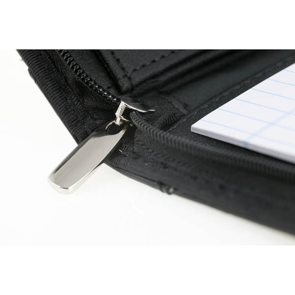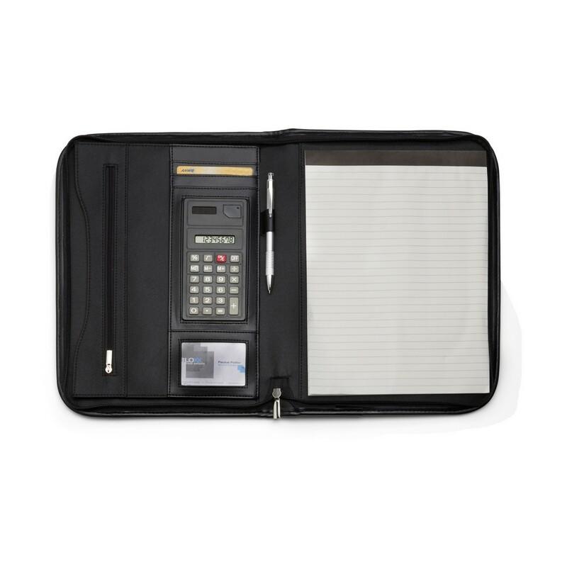 Teczka konferencyjna A4 na zamek, notatnik (20 kartek w linie, jednostronnie) i 8-cyfrowy kalkulator, chowane uchwyty
