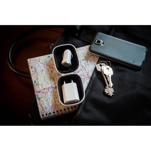 Podręczny zestaw w etui, adapter sieciowy (wejście 100-240V, 50/60HZ ±0.3A, wyjście 5V/1A) i ładowarka samochodowa 1000 mA (wejście 12-24V, wyjście 5V/1A)