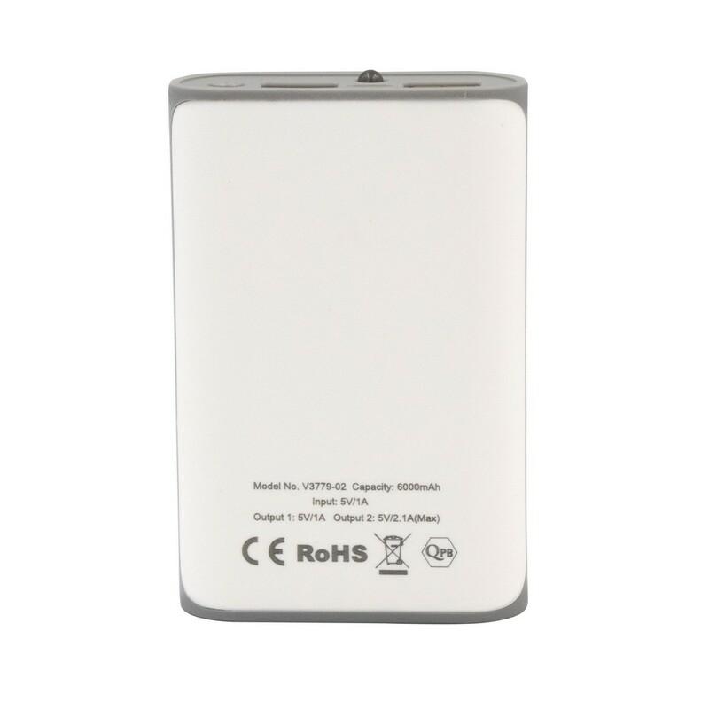 Power bank 6000 mAh, wyjście 5V/2.1A oraz 5V/1A, wejście 5V/1A, 4 diody wskazujące poziom naładowania, lampka LED, w komplecie kabel micro USB