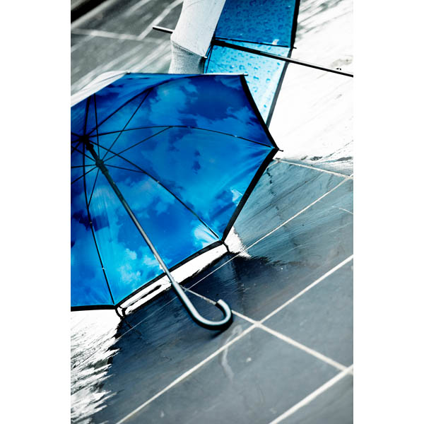 Parasol manualny, 8 paneli, z drewnianym trzonem i końcówkami, spodnia część ze wzorem chmur lub kropel deszczu, zapięcie na rzep