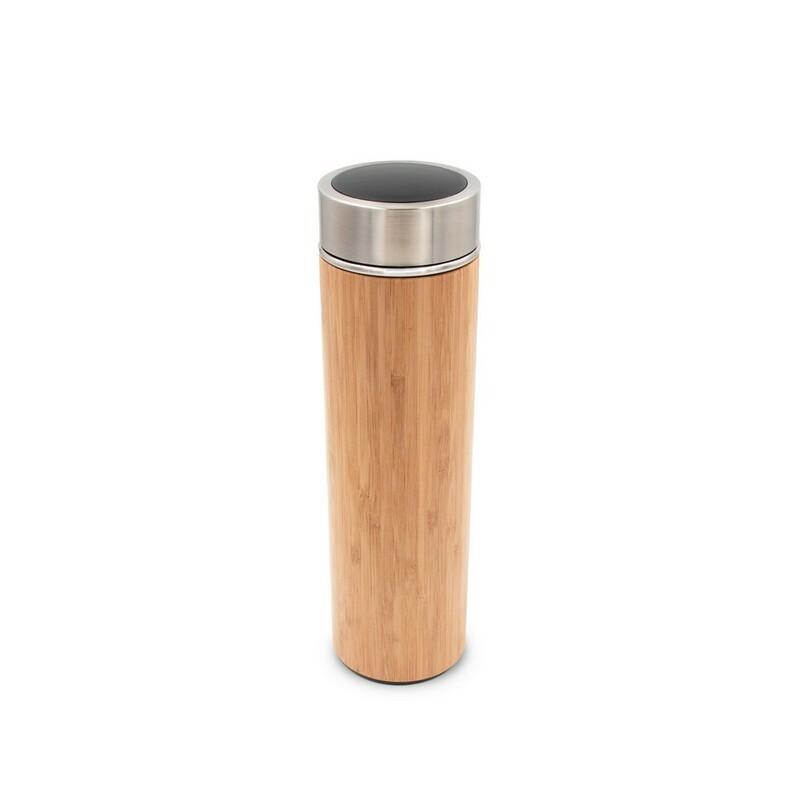 Bambusowy termos 500 ml, posiada wyjmowane sitko zatrzymujące fusy oraz zakrętkę z dotykowym cyfrowym wyświetlaczem temperatury napojów, podwójne ścianki ze stali nierdzewnej z próżnią między ściankami dzięki czemu długo utrzymuje temperaturę nie oddając jej na zewnątrz, klasa termiczna: 3 +leakproof