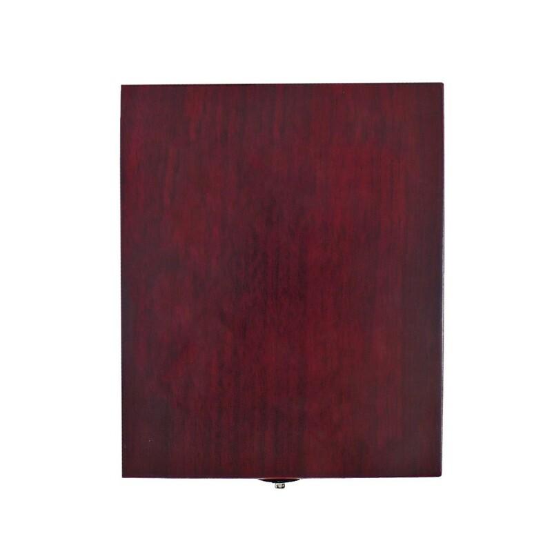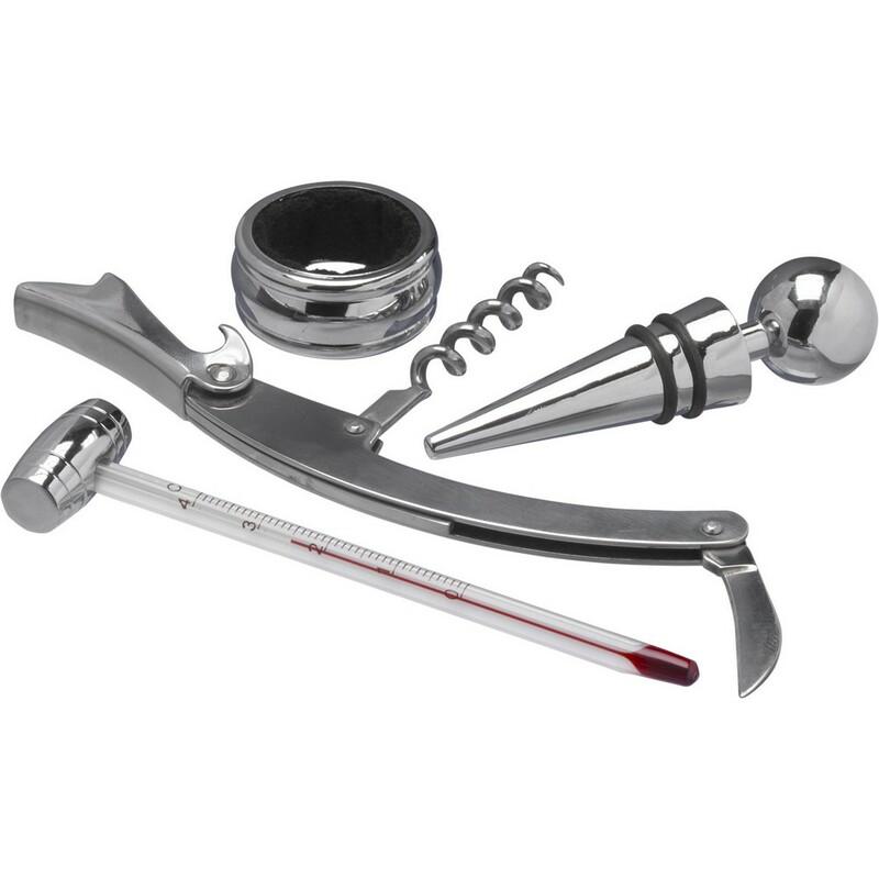 Zestaw do wina 4 el. w drewnianym pudełku, akcesoria do wina: nóż kelnerski, pierścień na butelkę, zatyczka, termometr
