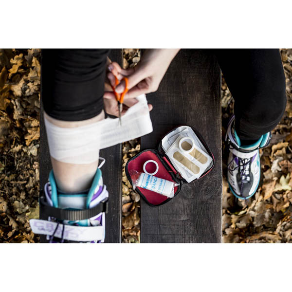 Apteczka w pokrowcu z mocowaniem do paska, główna przegroda na zamek błyskawiczny, 25 el., w tym: 10 plastrów, 4 płatki nasączone alkoholem, 2 taśmy, 2 nieprzylegające opatrunki, 2 bandaże, 2 waciki, 2 chusteczki nasączone mydłem oraz nożyczki
