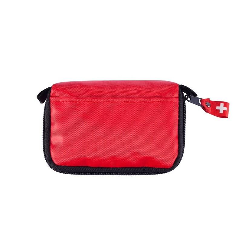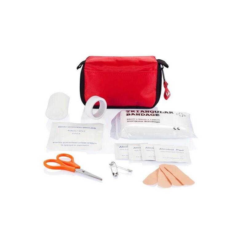 Apteczka w pokrowcu z przednią kieszonką i mocowaniem do paska, główna przegroda na zamek, 14 el., w tym: bandaż trójkątny, bandaż PTB, nożyczki, 4 plastry, 4 płatki nasączone alkoholem, 2 agrafki oraz taśma