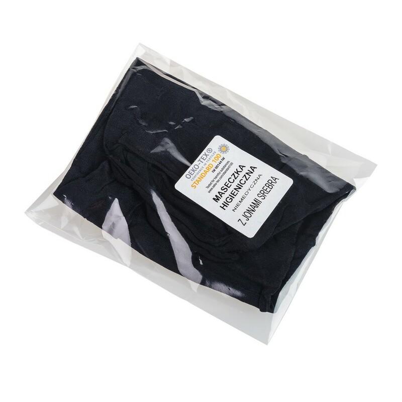 Maseczka wielokrotnego użytku z jonami srebra, niemedyczna, dwuwarstwowa, posiada miejsce na filtr, wykonana w 100% z poliamidu 250 g/m2, jony srebra utrzymują się do 20 prań, temperatura prania do 90 stopni Celsjusza, wyprodukowana w Polsce