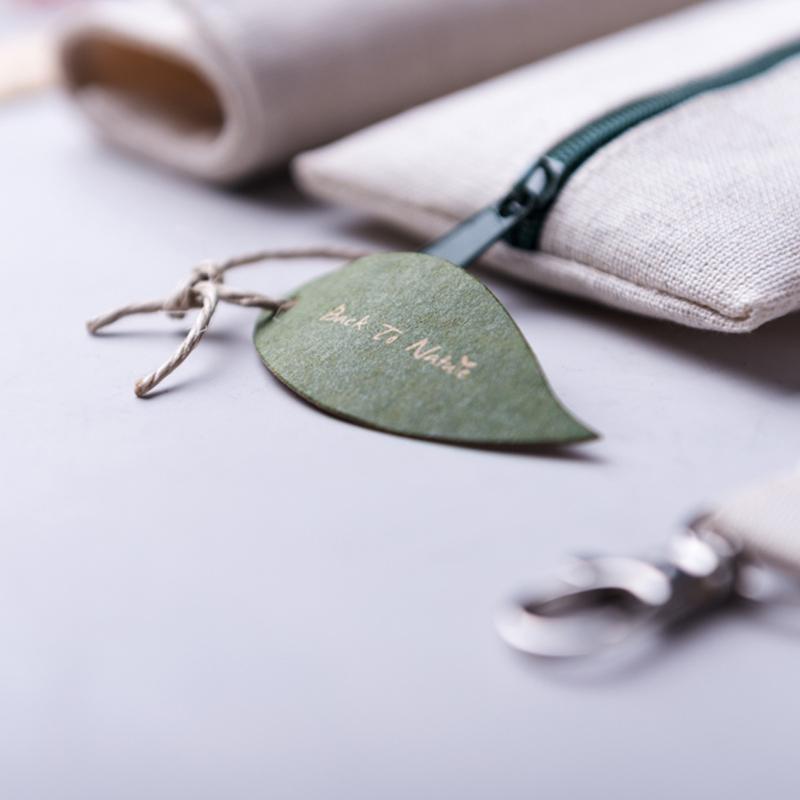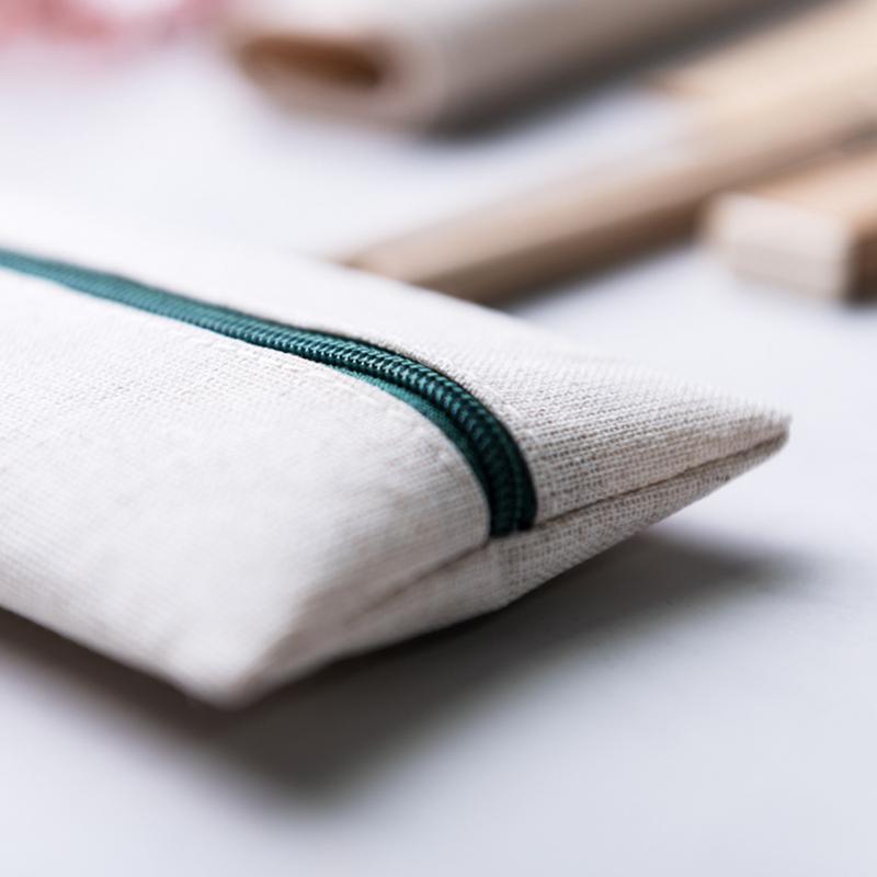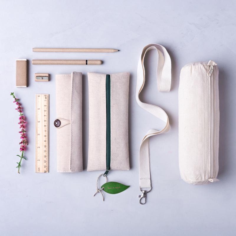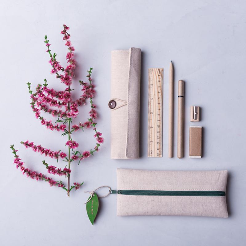 Zestaw szkolny w ekologicznym piórniku na zamek błyskawiczny, ołówek (nienaostrzony), długopis, linijka, gumka i temperówka