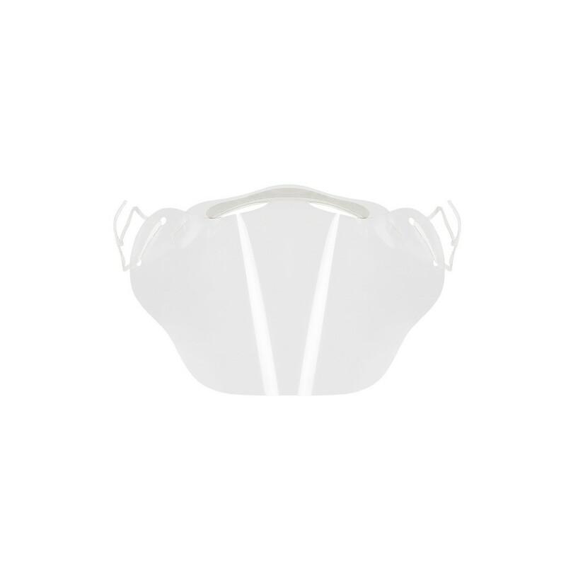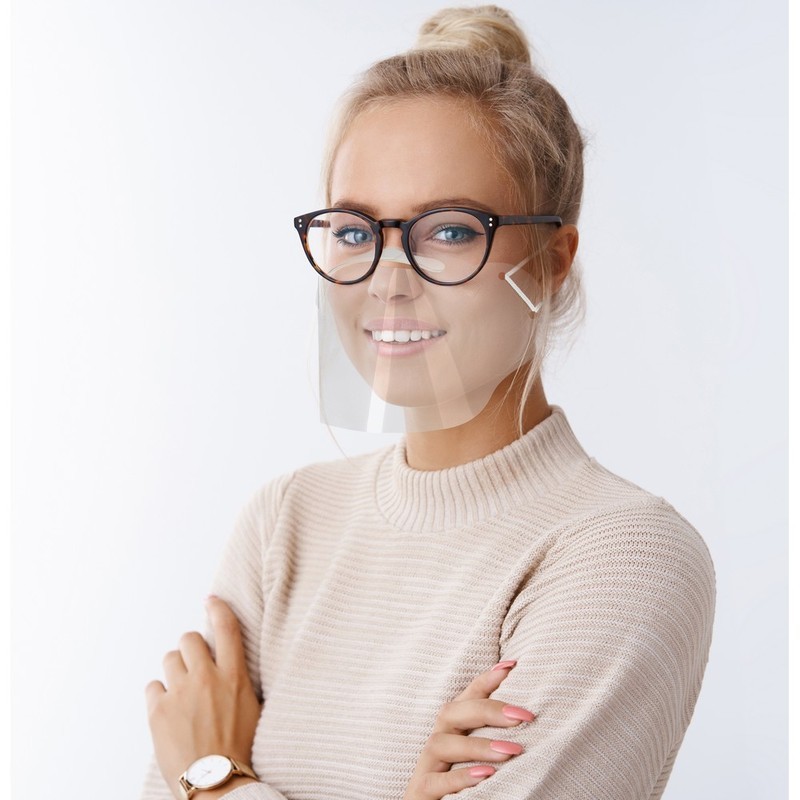 Osłona na nos i usta z elastycznymi mocowaniami, wielokrotnego użytku, wykonana z przezroczystego tworzywa PET, łatwa do dezynfekcji po każdym użyciu, łatwa w montażu, możliwość dopasowania długości gumek, duże otwory umożliwiające łatwą wymianę gumek, odpowiednio wyprofilowana pod okulary, posiada otwory zapobiegające parowaniu okularów, szeroki nosek z pianki poliestrowej dla większego komfortu użytkowania, wyprodukowana w Polsce