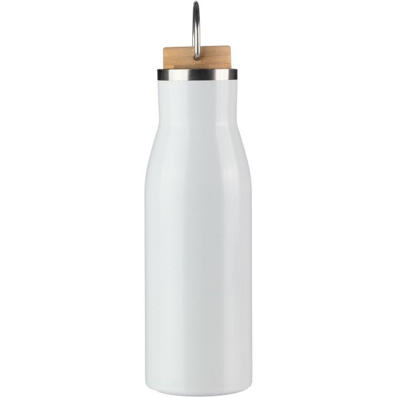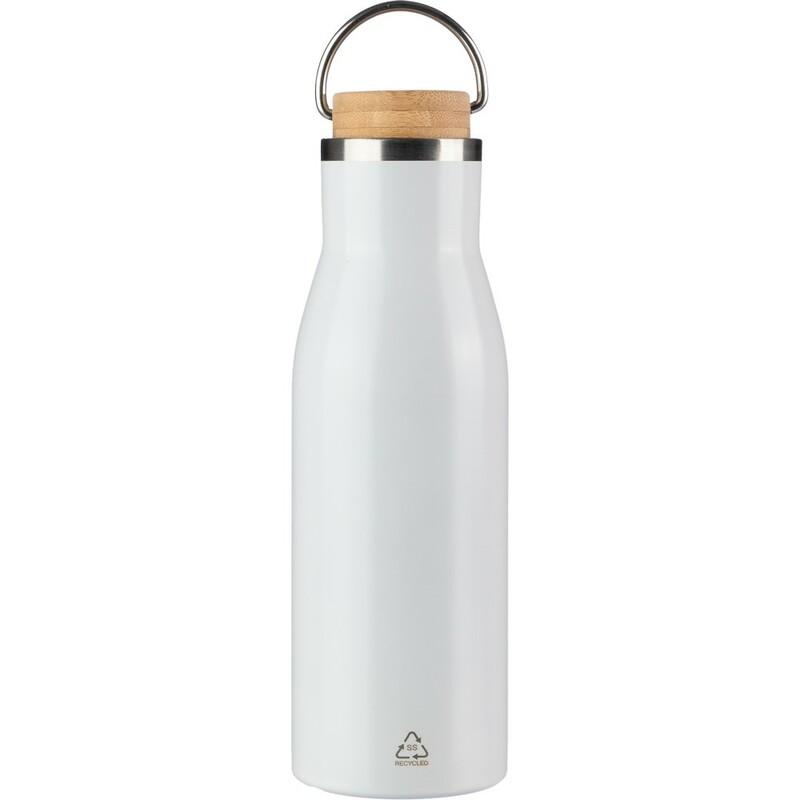 Butelka sportowa 500 ml, zakrętka z bambusowym elementem i metalowym uchwytem ułatwiający noszenie lub przypięcie, ikona stali z recyklingu na produkcie, produkt wykonany ze stali nierdzewnej recyklingu