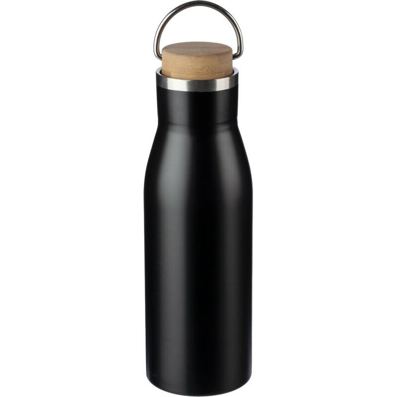 Butelka sportowa 500 ml, zakrętka z bambusowym elementem i metalowym uchwytem ułatwiający noszenie lub przypięcie, ikona stali z recyklingu na produkcie, produkt wykonany ze stali nierdzewnej recyklingu