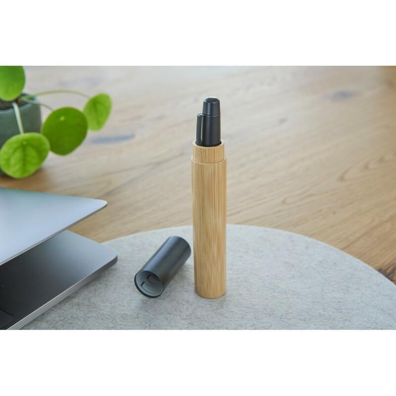 Długopis przekręcany z bambusowym trzonem, posiada niebieski wkład, bambusowa tuba chroniąca przed zniszczeniem w komplecie, produkt wykonany ze stali nierdzewnej