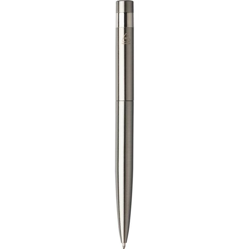 Długopis przekręcany, posiada wkład w niebieskim kolorze, ikona stali nierdzewnej z recyklingu na produkcie, zapakowany w pudełko prezentowe z papieru kraftowego, produkt wykonany ze stali nierdzewnej z recyklingu