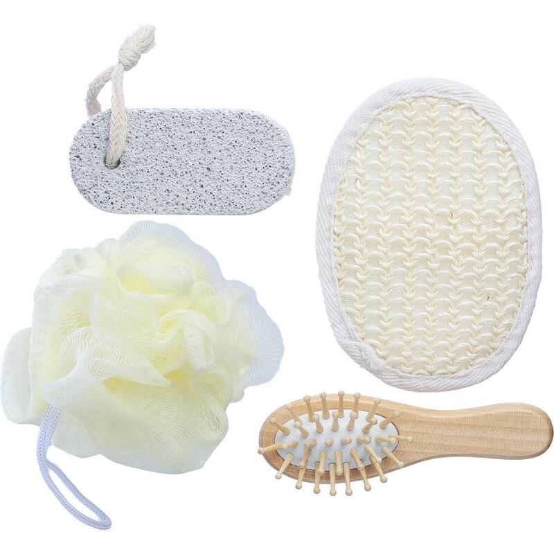 Zestaw kąpielowy, składa się ze szczotki bambusowej, miękkiej gąbki, gąbki do szorowania i pumeksu, wszystkie elementy zapakowane w bawełniany woreczek, produkt wykonany z bawełny, drewna i PE