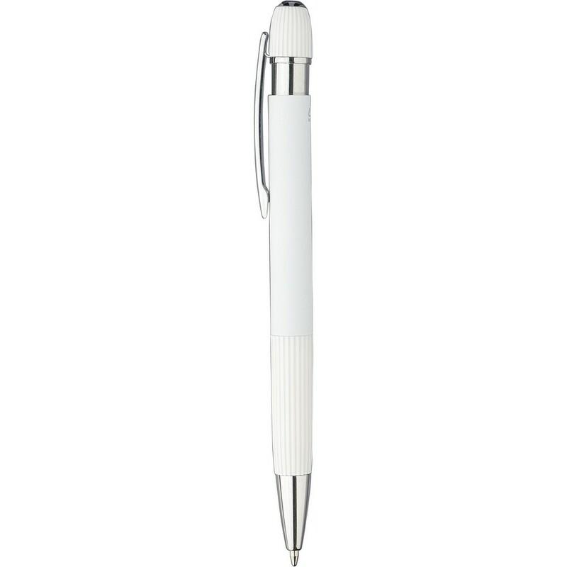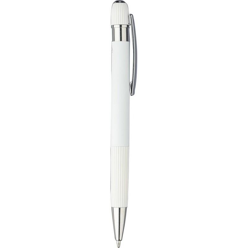 Długopis wykonany z aluminium, gumowe wykończenie, paskowane detale na trzonie i w górnej części, chromowana plastikowa końcówka, przycisk z metalowym klipsem, niebieski tusz, ikona recyklingu na produkcie