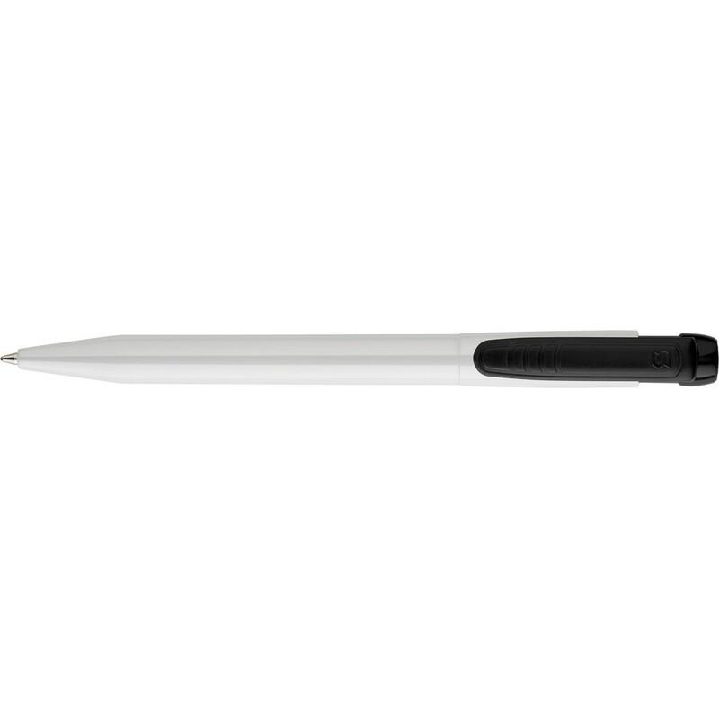 Długopis Stilolinea, biały trzon, kolorowy, szeroki klip, wkład w niebieskim kolorze, zawiera tusz German Dokumental Ink, produkt wykonany z ABS, plastiku, niklu i metalu