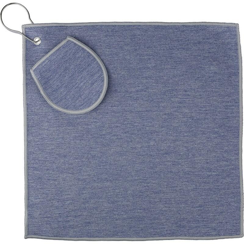 Ręcznik golfowy, z wbudowaną kieszonką na piłkę golfową, wyposażony w metalowy haczyk umożliwiający łatwe przymocowanie do torby, wewnątrz znajduje się ikona RPET na metce, można prać w pralce (na zimno), produkt wykonany z RPET