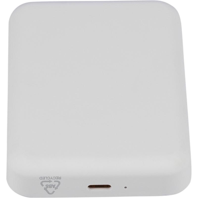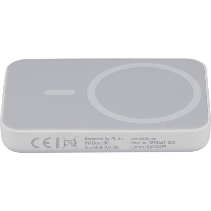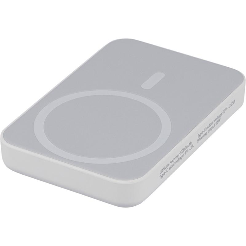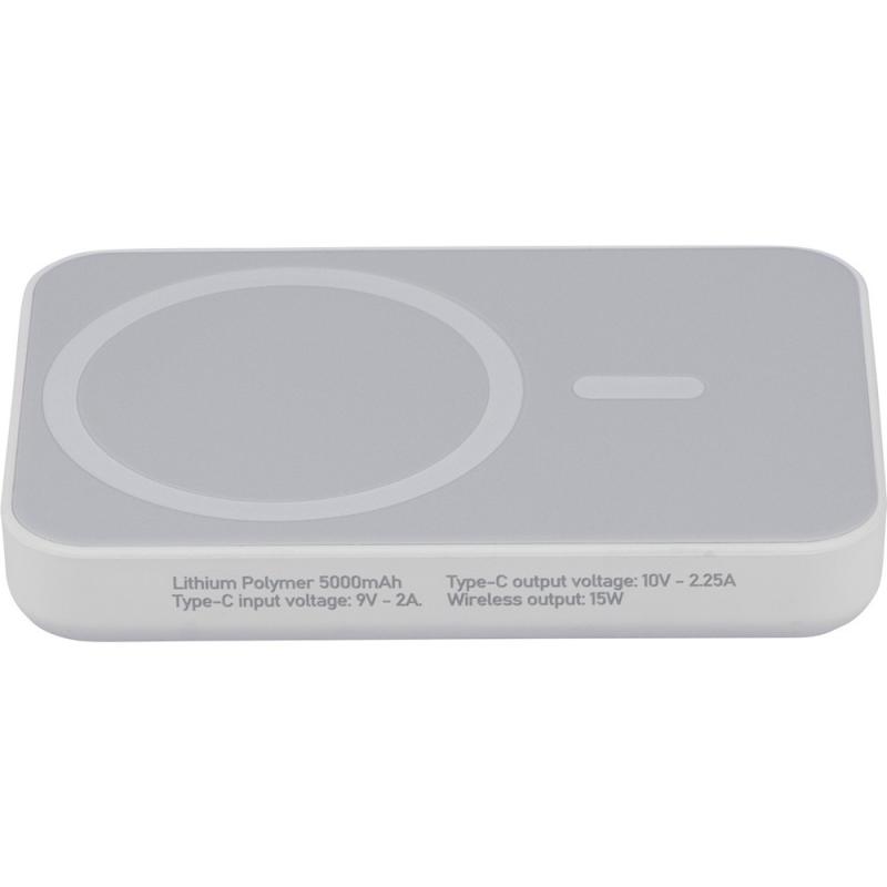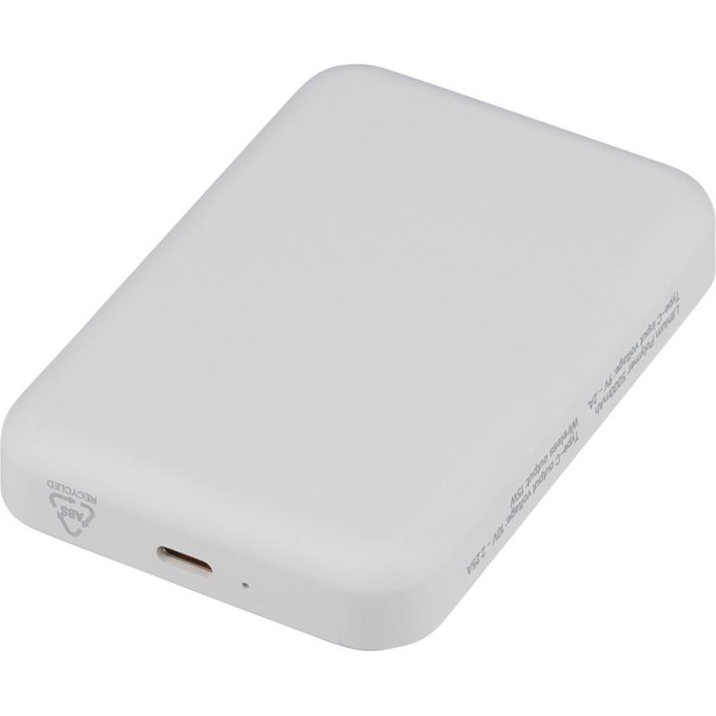 Bezprzewodowy Power Bank 5000 mAh, z wyjściem ładowania bezprzewodowego 15W, ładowanie przez końcówkę typu-C, wejście typu-C: DC 5V 3A, DC 9V 2A, wyjście typu-C: DC 5V 3A, DC 9V 2,22A, DC 12V 1,67A, zawiera ochronę przed przegrzaniem, zwarciem, przepięciem i nadprądem, zapakowany pojedynczo w brązowe pudełko kartonowe z papierowym wypełnieniem bez torebki foliowej, ikona RABS na produkcie, produkt wykonany z recyklingowego ABS z baterią litowo-jonową