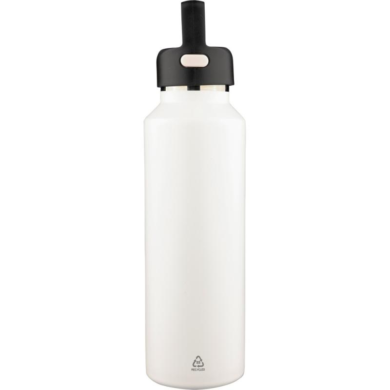Butelka termiczna 600 ml, posiada podwójne ścianki ze stali nierdzewnej z próżnią między ściankami, co spowalnia oddawanie temperatury na zewnątrz, zachowując funkcje termosu, uchwyt ułatwiający przenoszenie, zawiera przyciski po bokach do otwierania pokrywki, pakowany pojedynczo w brązowe kartonowe pudełko, produkt wykonany z recyklingowej stali nierdzewnej (wewnątrz 304 / na zewnątrz 201) z pokrywką z PP