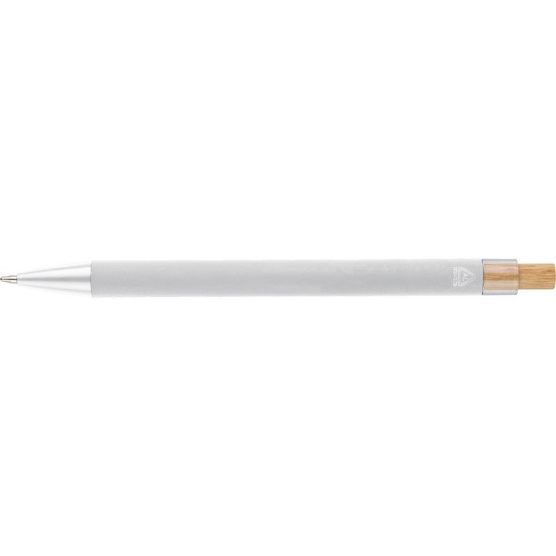 Długopis, bambusowy przycisk, metalowy klips, wkład w niebieskim kolorze, ikona recyklingu na produkcie, wystarcza na ok. 800 m pisania, produkt wykonany z ABS z recyklingu, aluminium i bambusa
